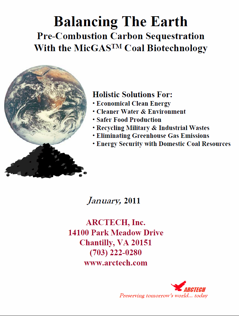 In 1995 Vice President Al Gore wrote a book entitled “Earth in the Balance”, highlighting the adverse global changes which have occurred since the industrial revolution and their impact on our very existence. He pointed out the adverse consequences of the emissions of greenhouse gases, the continued loss of top soil, and the pollution of our environment. He stressed an urgent need for global action to balance our human needs with our planet’s ecology and today he has been recognized for his efforts by being awarded 2007 Nobel Peace Prize. He and the general public are seeking drastic solutions, but many experts are concerned with costs to the worldwide economies, especially today, when there is a critical need to meet the basic requirements of rapidly increasing population and the burgeoning economic crisis. The MicGAS biotechnology offers an economic and practical approach of utilizing our vast resources of coal to reverse the adverse global impacts. Coal, to date has been primarily used as fuel or carbon. The MicGAS biotechnology converts coal into clean fuel gas (methane or natural gas) and organic humic matter. The primary strategy of the technology is to capitalize on the plant origin of coals to create highly useful carbon-rich humic products, while bio-converting coal into methane gas for production of affordable, clean energy. The humic matter derived from coal is same as the natural humic component of organic soil matter, and is useful for replenishing soils for increased food production, recycling wastes, and cost effectively cleaning our contaminated waters and soils. This results in sequestration of carbon while fostering worldwide economies with green products made from coal. The U.S. DOE in 2007 highlighted this biotechnology approach among the fourteen transformational technologies. The industrial revolution, which started about two centuries ago, has been fueled with ever increasing use of fossil fuels, most notably coal. This has resulted into unprecedented economic growth worldwide, and has changed forever our relationship with our planet earth. One of the major impacts now recognized is global warming resulting from build up of greenhouse gases, especially CO2 due to burning of fossil fuels. The greenhouse effect, by which a small amount of solar heat is retained near the surface of our planet, is critical to maintain the fragile life and ecology. However, unacceptable levels of accumulation of these gases in our atmosphere is now believed to cause gradual heating of the planet. This effect has the potential to cause drastic adverse ecological imbalances for inhabitants throughout the world. In December of 1997, the United Nations sponsored a Global Climate Convention held in Kyoto, Japan. At this convention, 160 Nations gathered for landmark negotiations and negotiated a treaty to reduce worldwide gas emissions. The objective of the treaty is to reduce emissions levels to those below 1990 levels, between 2008 and 2012. Next round of negotiations are planned later this year in Copenhagen to establish reduction levels beyond 2012 and pressure is mounting on the U.S. to join the treaty. Today, the U.S. is home to only 5% of the world’s population but emits over 25% of its greenhouse emissions. The new U.S. Administration has set a goal to drive emissions to 80% below 1990 levels by 2050, which were 5 billion tons for CO2, the largest greenhouse gas. This goal was included in the House Bill, recently passed by a very thin margin. The energy experts agree with the overall reduction levels, but are concerned with the lack of viable technological solutions and predict that this requirement will drive up the cost of electricity and fuels. The climate experts assert that significant rapid reductions are critical to reverse the ecological impacts. Many are still questioning global warming and are concerned with its high costs. Today, in spite of the economic crisis, it has become urgent to address this planetary need not only by the U.S. but also by the majority of the inhabitants of this world. Coal, being the least efficient fuel in terms of Btu to electric energy, and highest CO2 producing fuel compared to natural gas and petroleum fuels, faces a serious challenge and may become obsolete. Coal is the most abundant and cost-effective biomass (albeit buried biomass) available today. Carbon contained in coals costs less than 1 cent per pound, whereas cultivated biomass is 10-20 times more expensive as it consumed enormous amount of energy and other resources to produce. Sustainability of abundant coal resources as a viable fuel in the strategy is not only needed to produce low cost energy, but also to sustain the enormous economic infrastructure which millions of Americans depend upon for employment. The power industry depends upon coal for more than one-third of its fuel needs, and constitutes the largest market for coal. The conventional method of generating electricity with coal involves spraying finely pulverized coal, along with hot air, into a furnace chamber lined with water-filled coils. Coal burning inside the chamber converts the water in the tubes to steam, which is then used to rotate a turbine-power generator. This process, devised more than a century ago, is termed the “Rankine Cycle”. The use of emissions controls has recently been mandated to prevent pollutants such as sulfur dioxide and fly ash from being discharged into the atmosphere. Alternatives to this approach have also been explored. However, successes in the development of synthetic fuels and coal gasification have been limited due to the high costs involved with these conversion technologies. Today, due to increasing dependence on vulnerable supply sources of oil, coal is again being considered for production of synthetic fuels utilizing the WWII thermal technologies. Technologies based on these thermal conversion have been in use in South Africa for many years. These plants were built in S